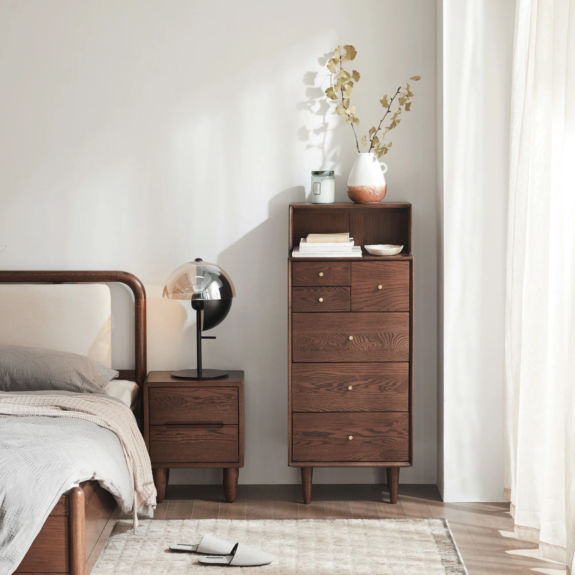 This Fuji chest is made from solid red oak,and offers complete bedside or living room storage, fitting in with any modern, classic and mid century setting with ease.