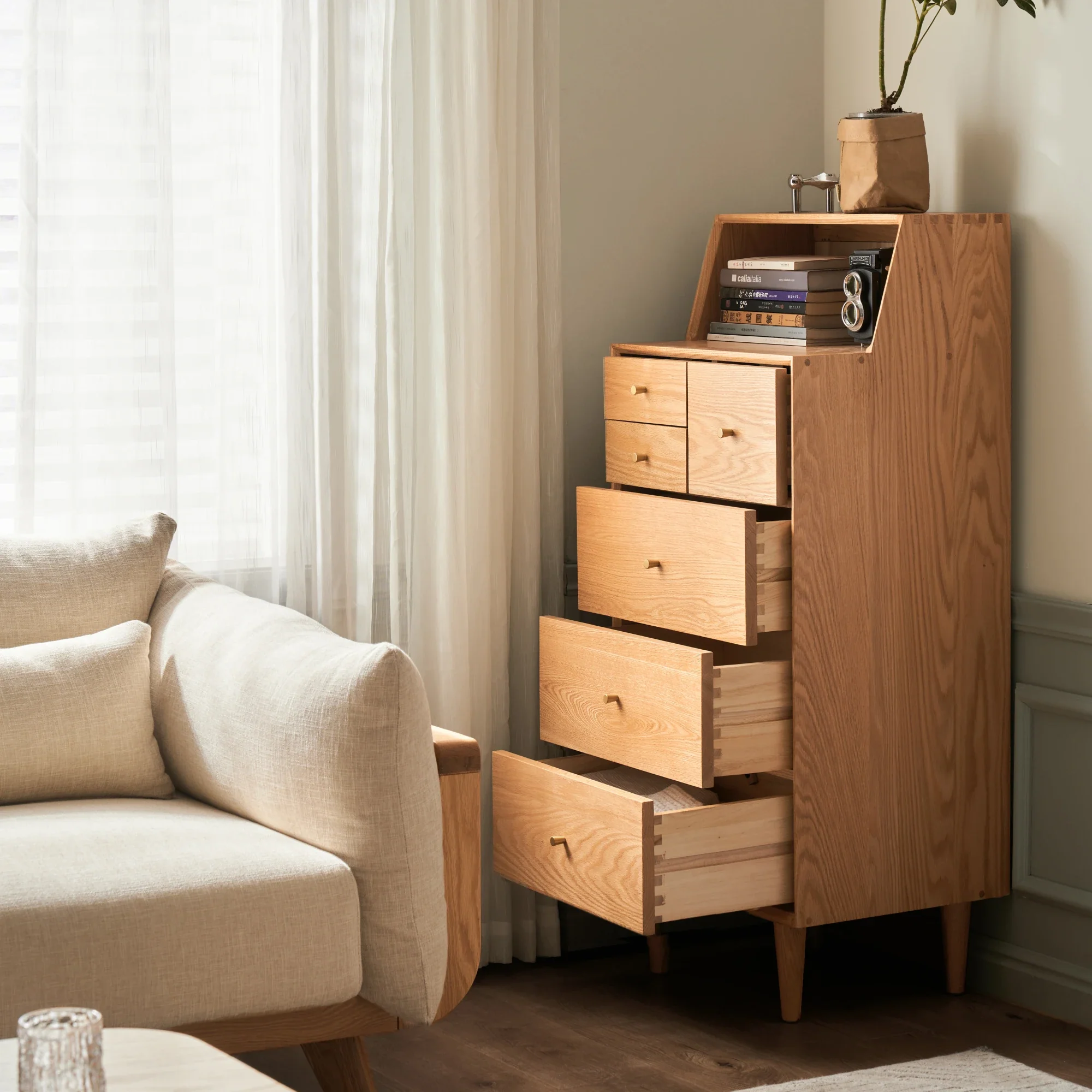 This Fuji chest is made from solid red oak,and offers complete bedside or living room storage, fitting in with any modern, classic and mid century setting with ease.